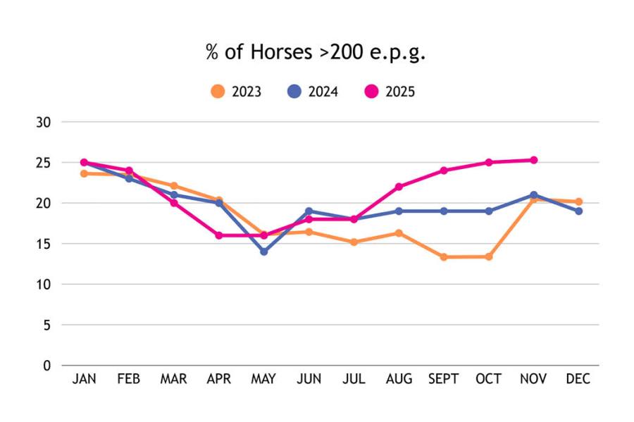 Monthly summary of equine worm egg count results for 2025 shows a higher proportion of horses shedding more strongyle eggs compared with previous years.