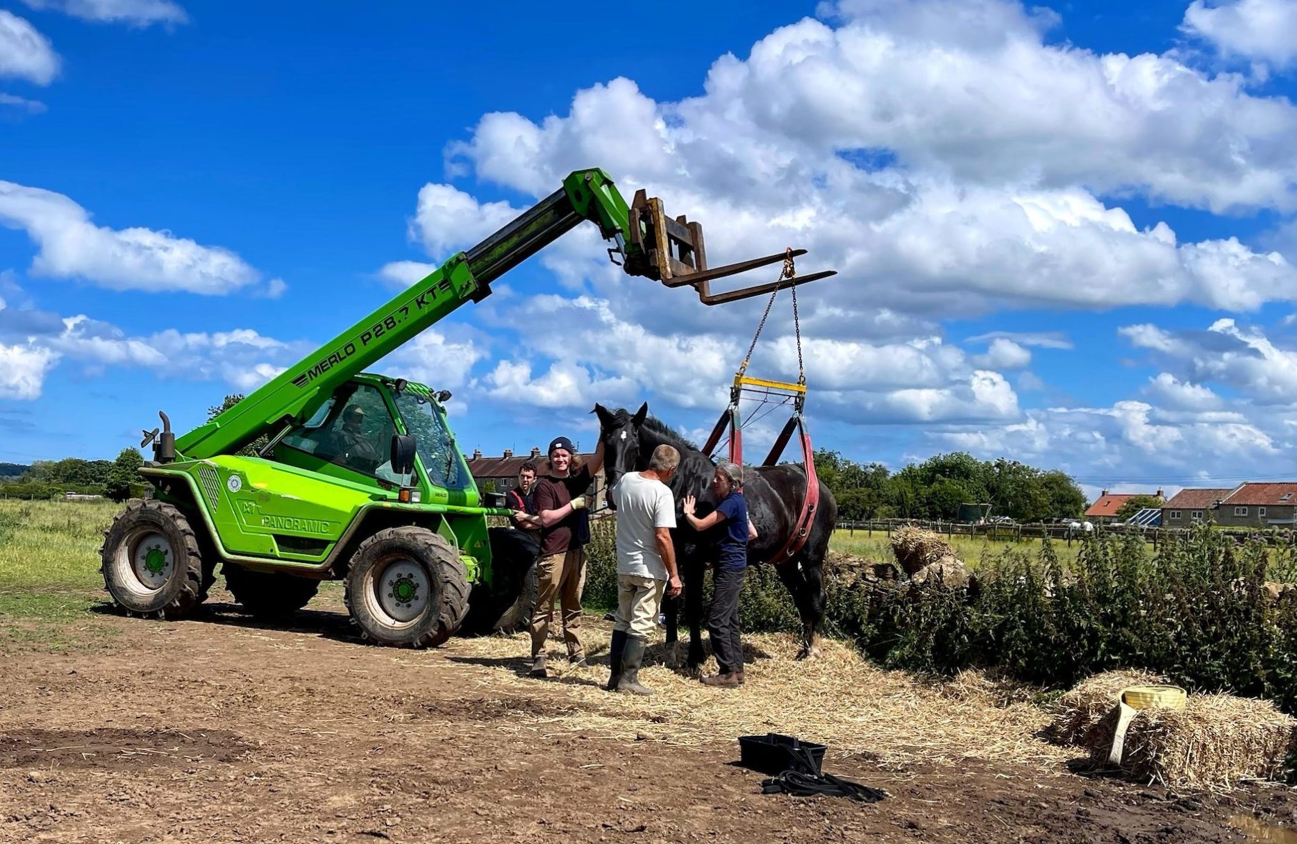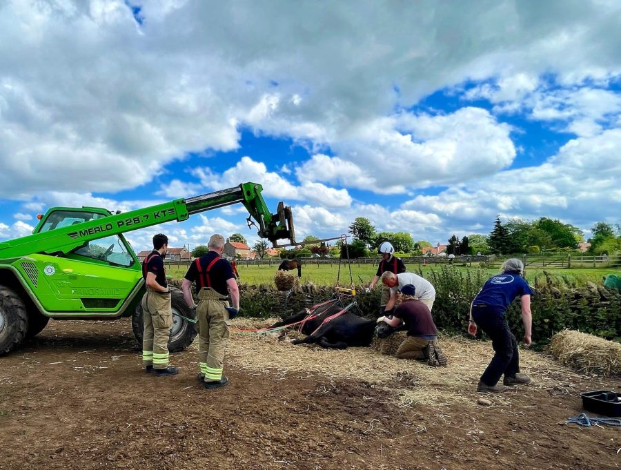 “Crew went to the aid of a horse that had fallen five hours earlier becoming stuck, despite the efforts of it’s owner and vet,” said a spokesman for North Yorkshire Fire and Rescue Service. “He was safely put back on his hooves by use of animal rescue equipment and use of the owner’s telehandler, and left in their care.”
